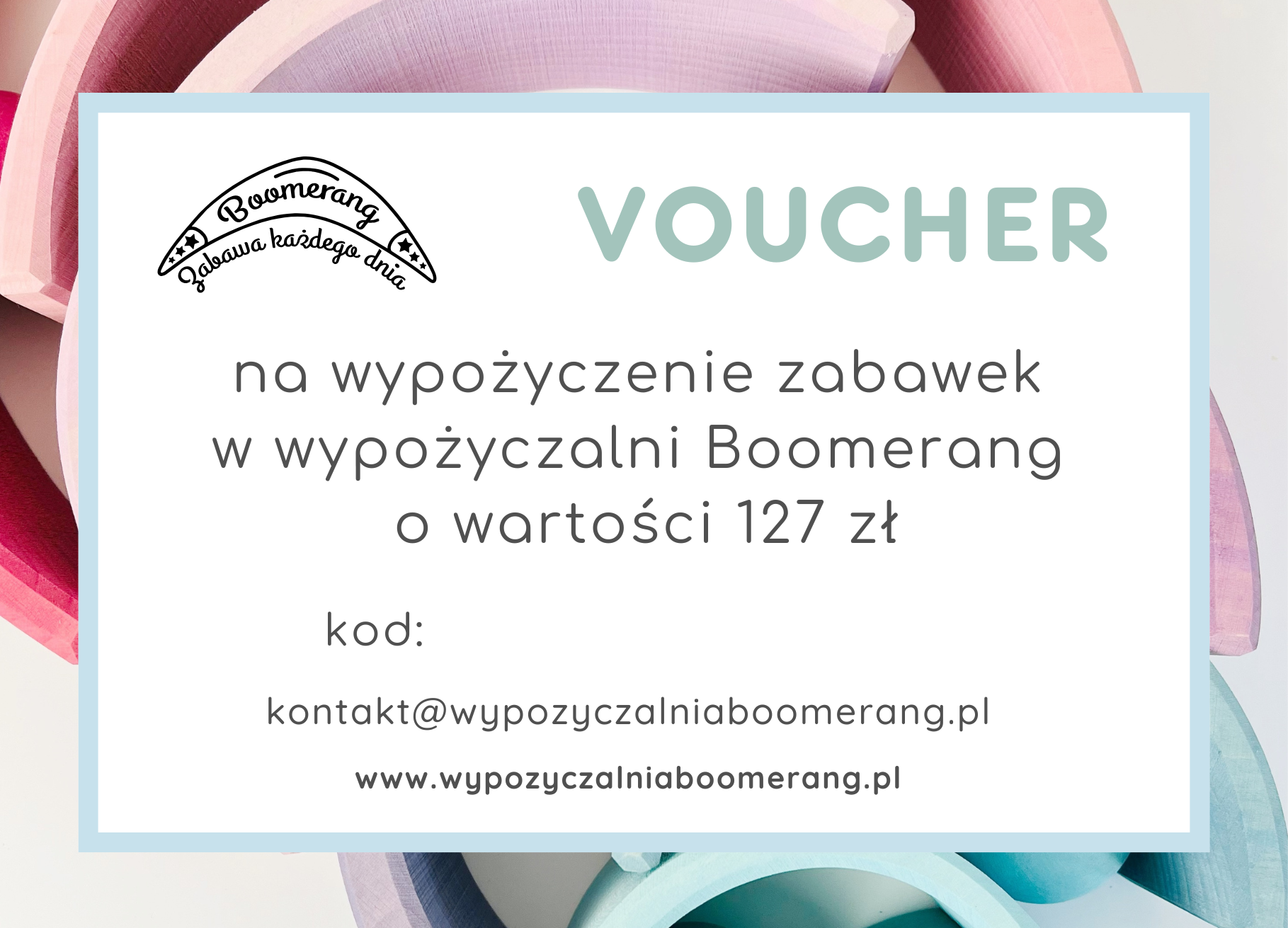 Po zakupie vouchera obdarowana osoba może wykorzystać go na wypożyczenie dowolnych zabawek dostępnych w ofercie Boomerang. Voucher można zrealizować online, wybierając zestawy dopasowane do wieku dziecka.